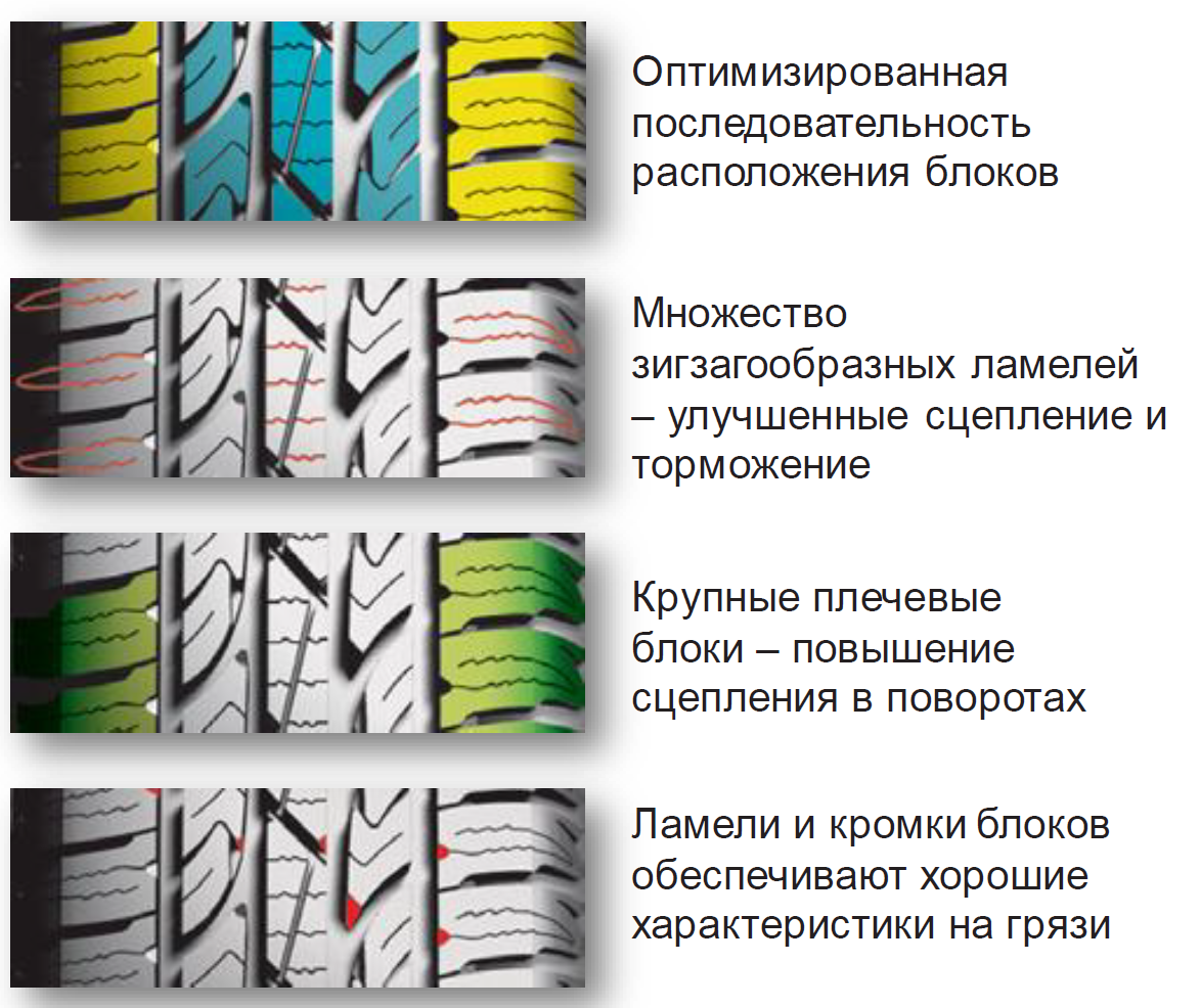 - Поперечная устойчивость — плечевые зоны, конструктивно отделённые от основной части протектора, состоят из крупных блоков с рельефными гранями, благодаря которым автомобиль чётко следует заданной траектории с малым риском заноса.